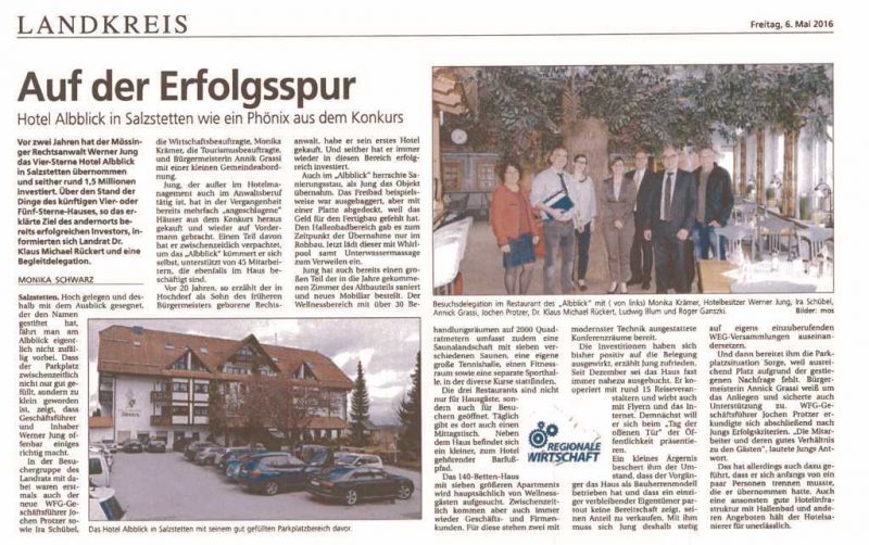 Vor zwei Jahren hat der Mössinger Rechtsanwalt Werner Jung das Vier-Sterne Hotel Albblick in Salzstetten übernommen und seither rund 1,5 Millionen investiert. Über den Stand der Dinge des künftigen Vier- oder Fünf-Sterne-Hauses, so das klare Ziel des andernorts bereits erfolgreichen Investors, informieren sich Landrat Dr. Klaus Michael Rückert und eine Begleitdelegation.