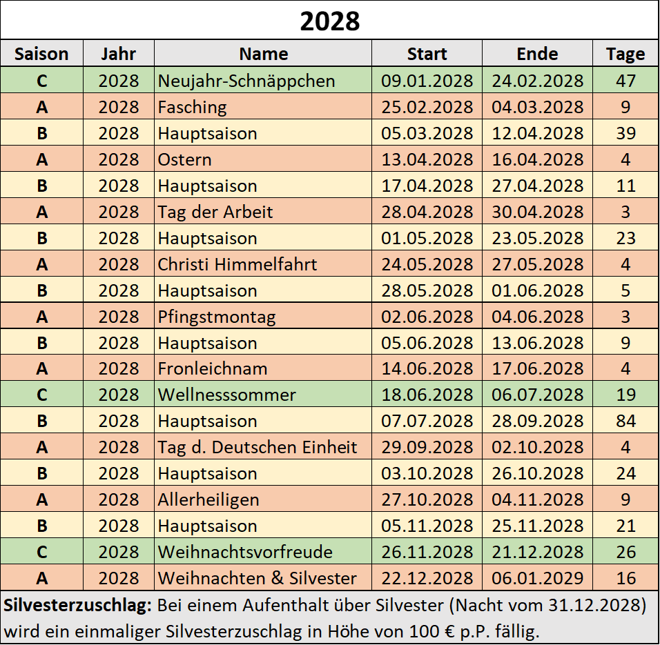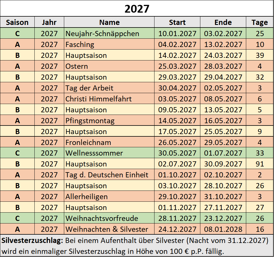 - A-Saison: + 10 € Feiertagszuschlag pro Person und Nacht